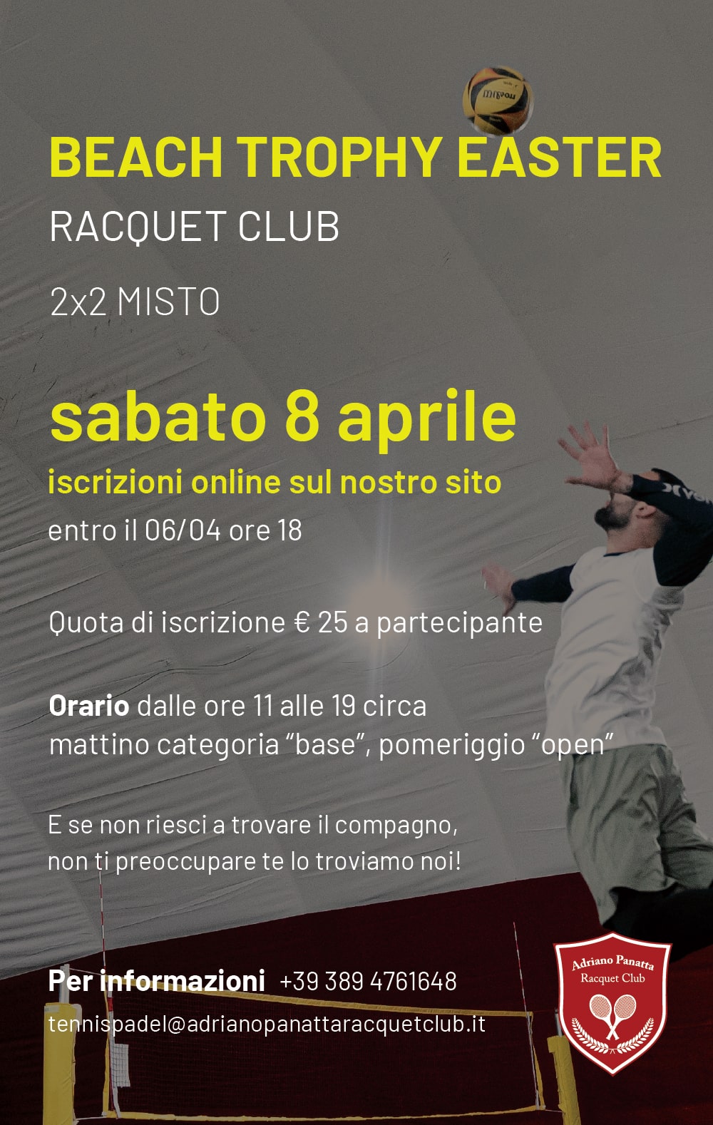 Iscriviti online al Torneo di Pasqua di Beach Volley organizzato dall’Adriano Panatta Racquet Club.